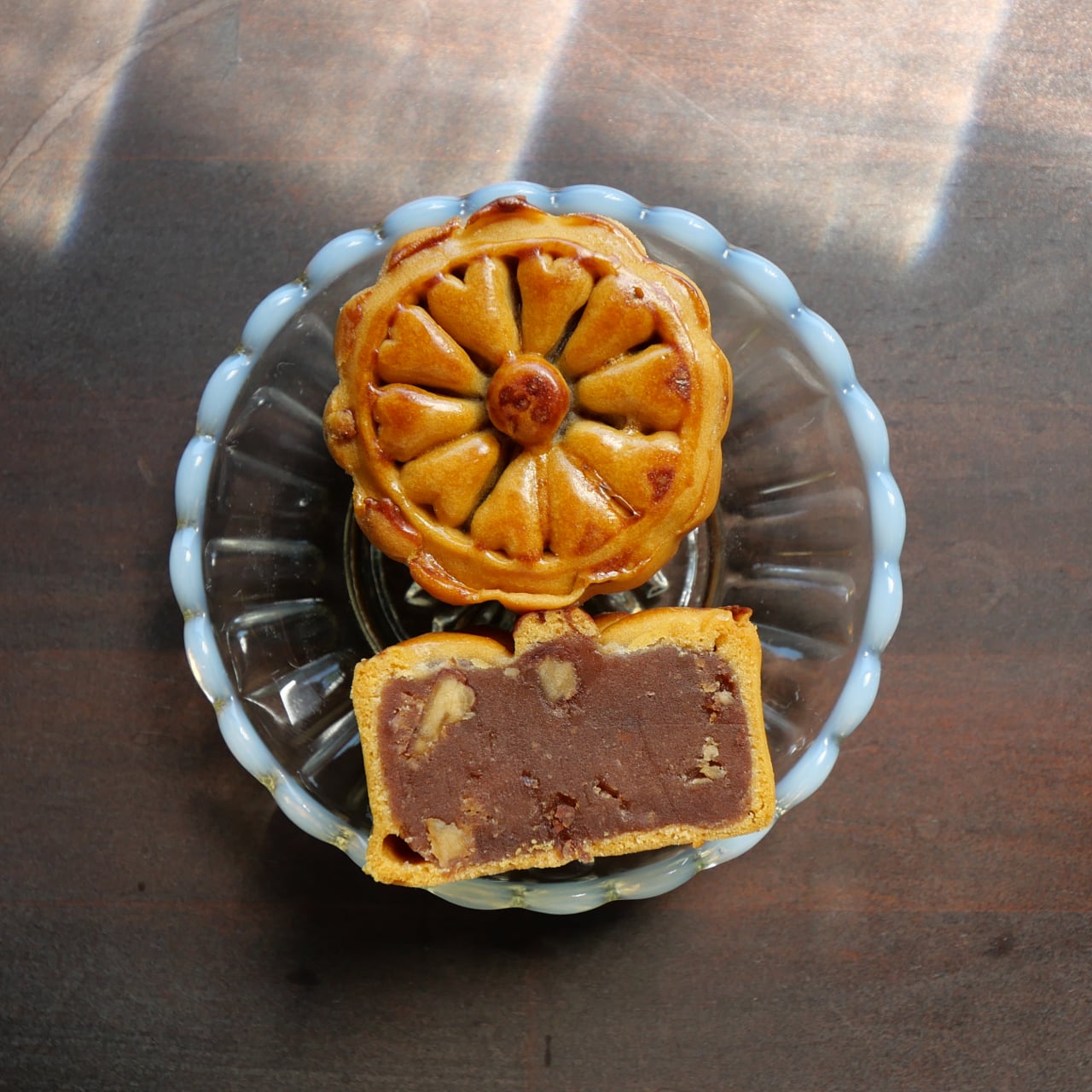 くるみ、栗、胡麻、杏、棗、柚子、デーツ、ラムレーズンがぎゅっと詰まった月餅